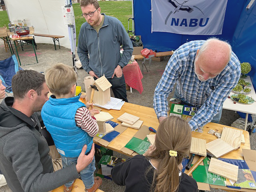 Schloß Neuhaus: Mittendrin im Zukunftsgarten, einer Veranstaltung von „Typisch paderbörnsch“ im Marstall-Innenhof in Schloß Neuhaus, war auch der NABU Paderborn vertreten. Am NABU-Stand wurden nicht nur viele gute Gespräche geführt, vor allem für junge Naturfreund:innen gab es alle Hände voll zu tun: Sie bauten unter Anleitung von Hans Günter Festl, Reinhold Ix und Jonas Flach Nisthilfen, Futterhäuser und Insektenhotels. Das Gehämmer war weit über den Platz zu hören und lockte immer wieder weitere Mädchen und Jungen mit ihren Familien an. Ruhiger, aber nicht weniger interessant ging es bei der mittäglichen Wanderung von Harald Heiermeier zu. Der zertifizierte Naturtrainer entführte zum renaturierten Krebsbach. Abgerundet wurde die gelungene Veranstaltung durch viele Gespräche, bei denen neue Kontakte geknüpft wurden.